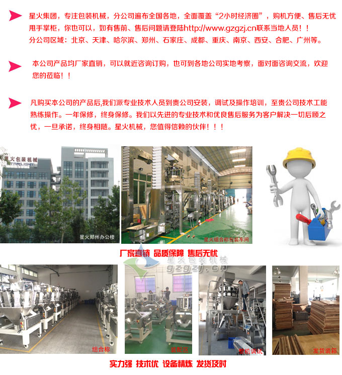 該全自動薯片薯條包裝機為星火研制的多頭組合稱包裝機,專業(yè)包裝薯片薯條、貓耳朵等膨化食品而研制,故又稱膨化食品自動包裝機械。整機自動化程度高,全自動完成送料,計量,充填制袋,打印日期,產(chǎn)品輸出全部生產(chǎn)過程,十頭電腦組合秤,計量精度高、效率快,不易碎料,包裝形式多樣:背封、插角、連袋、沖孔等。 1.4230全自動包裝機 2.十頭電腦組合秤 3.Z型物料輸送機 4.振動送料機 5.支撐平臺 6.成品輸送機 ![]() 1、采用雙伺服電機控制,拉膜更準確,速度更快。 3、橫、縱封溫度獨立控制,能良好的適用各種復合膜、PE膜等包裝材料。 4、精度高、噪音小。