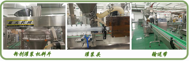 其中粉劑灌裝機(jī)采用了先進(jìn)的PLC+伺服馬達(dá)+觸摸屏等先進(jìn)模式,整套設(shè)備性能穩(wěn)定、精度高,全不銹鋼結(jié)構(gòu),整個灌裝過程采用了智能的控制系統(tǒng),能完成瓶子自動定位、充填及計(jì)量等工作,他由一個充填頭、一臺鏈板輸送帶及一個定位裝置組成,是一款經(jīng)濟(jì)實(shí)用的粉末及小顆粒自動灌裝機(jī)。另外該套設(shè)備配有位置合理的高度調(diào)節(jié)手輪 ,方便調(diào)整機(jī)頭高度。其配套裝置包括:氣動閥門裝置、防漏離心裝置、托罐裝置、水平開啟式料箱、在線稱重計(jì)量裝置、除塵裝置